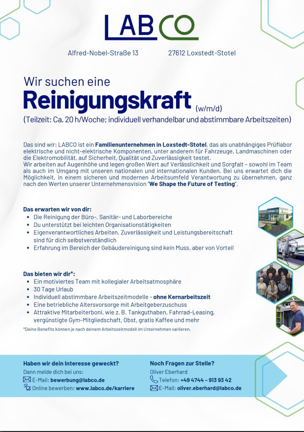 Das sind wir: LABCO ist ein Familienunternehmen in Loxstedt-Stotel, das als unabhängiges Prüflabor elektrische und nicht-elektrische Komponenten, unter anderem für Fahrzeuge, Landmaschinen oder die Elektromobilität, auf Sicherheit, Qualität und Zuverlässigkeit testet.